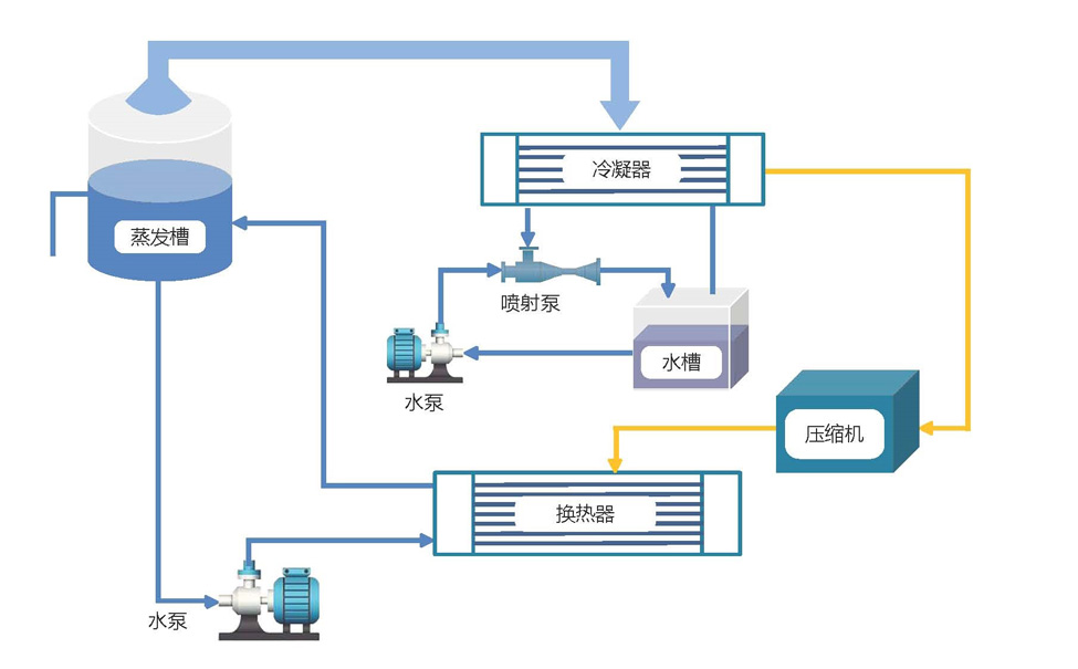 污水槽中的污水通過水泵的帶動下通過換熱器循環加熱,槽中的受熱氣化的水份通過真空下的蒸發被帶到凈水槽,實現凈水回收。利用壓縮機在冷凝器和換熱器之間實現熱交換。